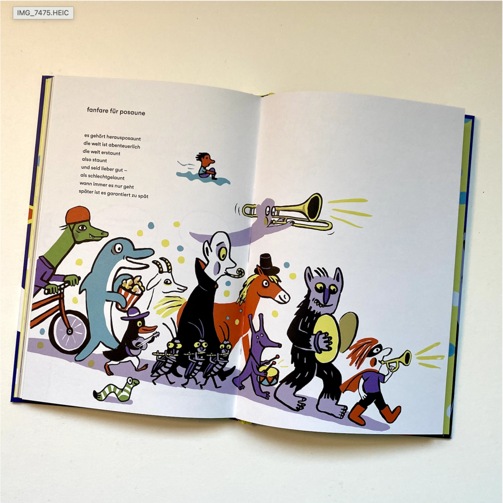 Einen wunderbaren bildhaften Raum gibt all dem Spektakel die Leipziger Künstlerin Halina Kirschner. Mit frechem und witzigem Strich und einer fantastischen Farbpalette bringt sie die Figuren zum Strahlen und entlockt auf jeder Seite ein Lächeln. Für alle, die Gedichte, Sprachspiel und Illustrationskunst lieben.